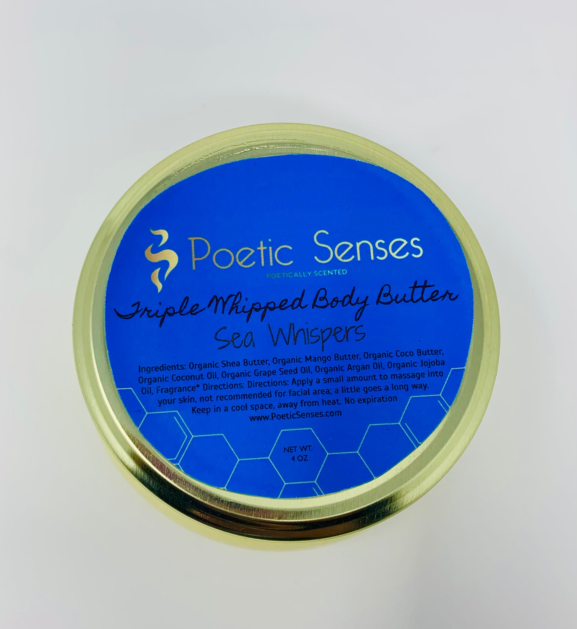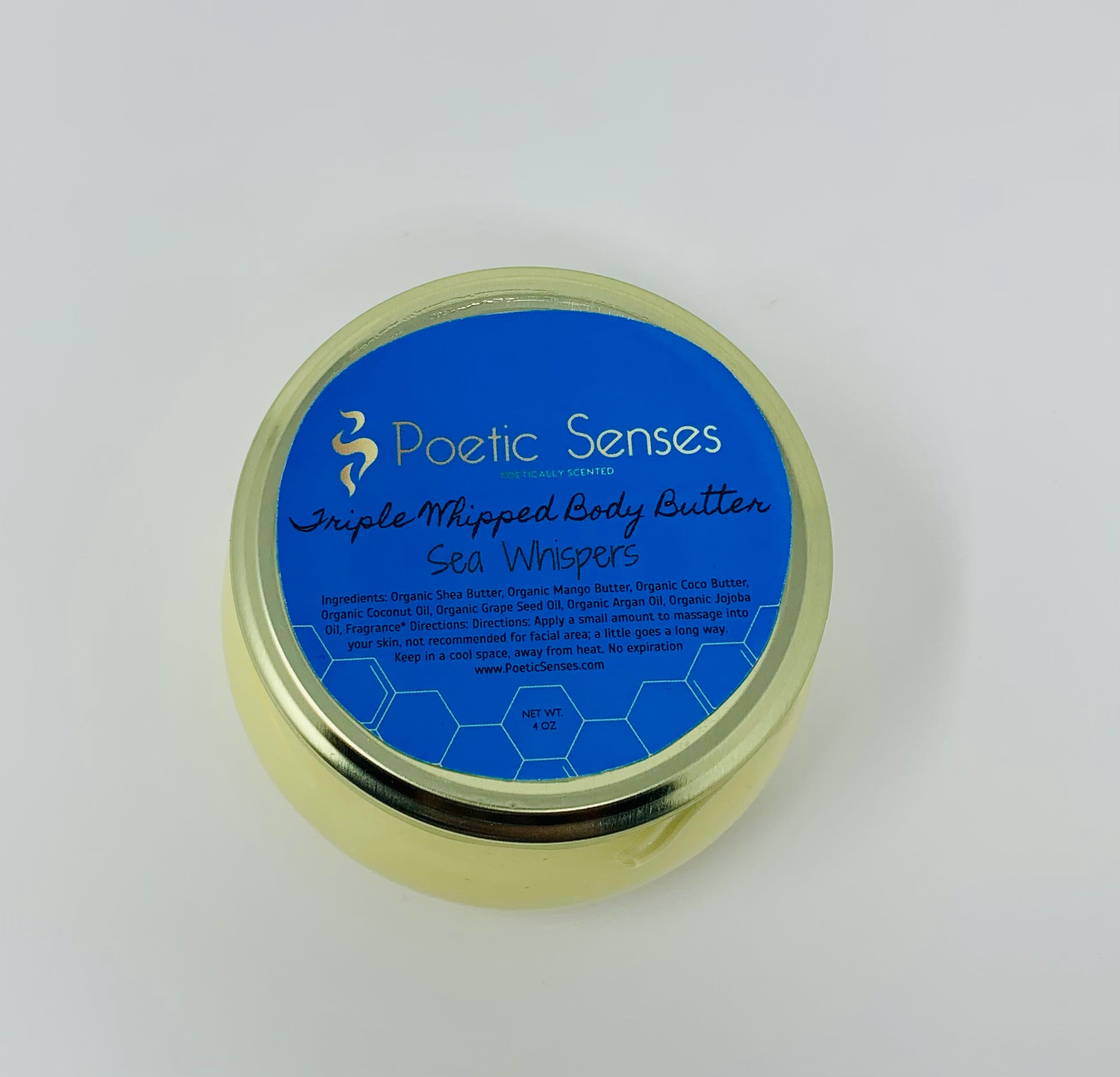 Drift into serenity with Poetic Senses Sea Whispers Triple Whipped Body Butter—a handcrafted blend of Shea, Mango, and Cocoa Butters, whipped to a cloud-like texture that melts effortlessly into the skin. Infused with premium botanical oils, this luxurious formula provides long-lasting hydration, nourishment, and protection while leaving your skin soft, radiant, and deeply moisturized.